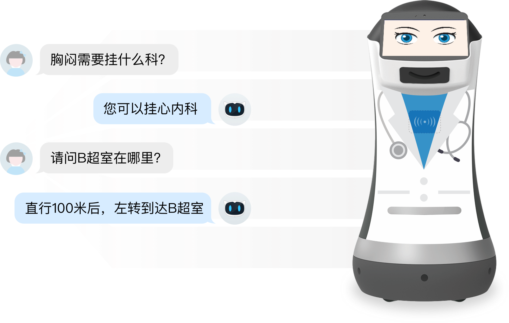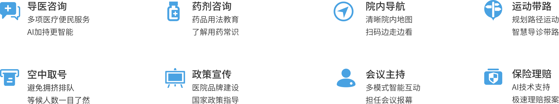 依托智能机器人作为服务载体,深度融合智能科技与医疗资源,为患者提供多项医疗便民服务, 打造医疗科技便民服务新模式, 充分释放医疗服务价值,提升患者获得感与满足感。